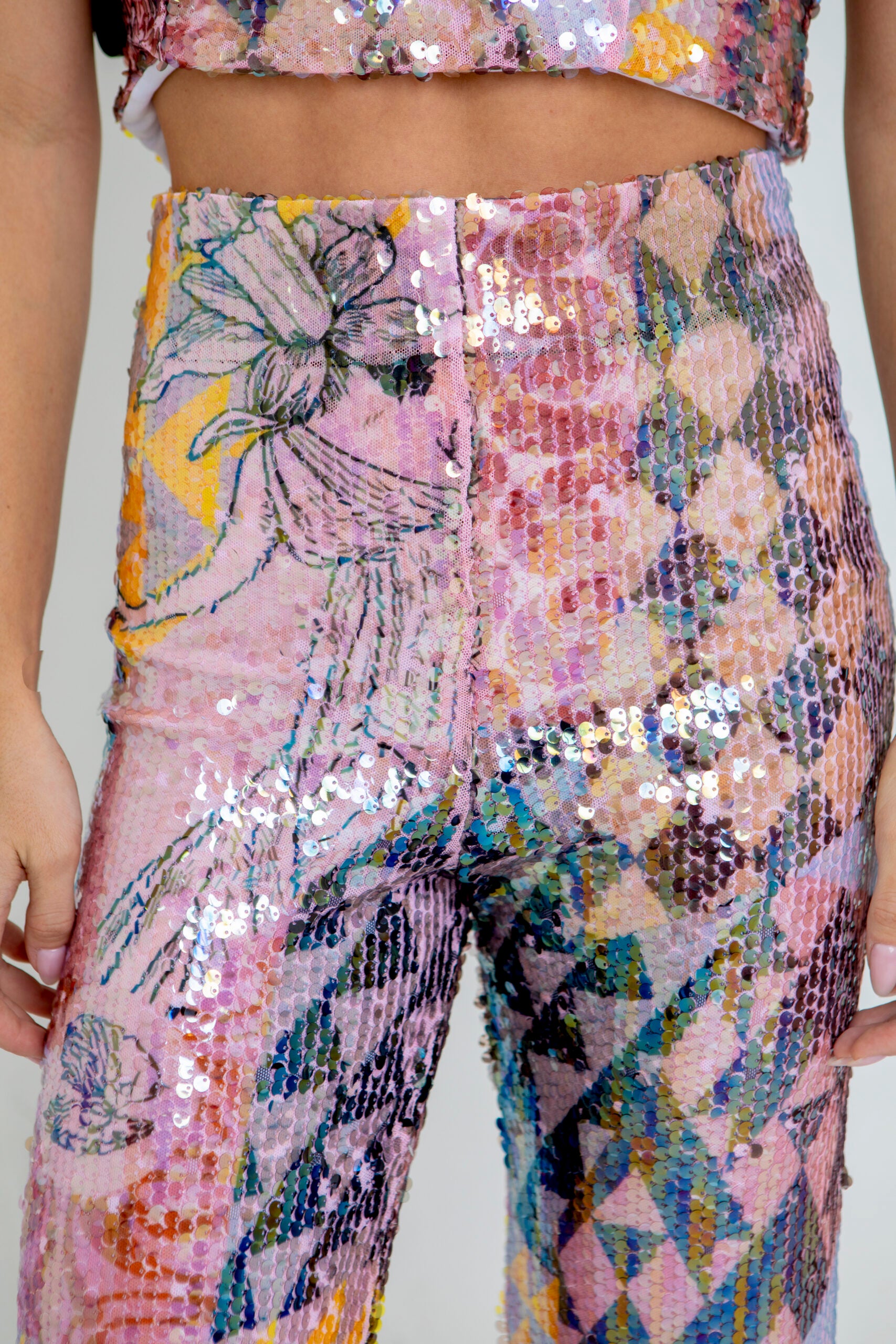 Sequin trousers with inner lining. Our fabric is made of 100% recycled polyester, promoted as an environmentally friendly fabric. This fabric has an extremely strong moisture-wicking characteristic that allows the body to cool down. This thin fabric has good breathability that protects the body from damp sweat. For the care of your garment, it is recommended not to soak it for too long, wash by hand, do not wring, and do not use bleach. We recommend ironing your garment when slightly damp and at a temperature between 100 and 160 degrees Celsius.